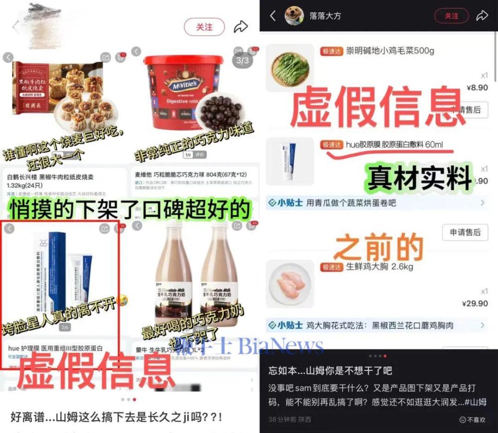 深入观察就能发现,这些在抖音、小红书等平台发布信息的账号,大多带着明显的“带节奏带货”痕迹:有些账号一边质疑山姆的选品水准下滑,另一边顺势推荐所谓的根本未在山姆销售的“被下架好货”;有些账号抨击山姆选品大众化,通过对比山姆商品与自有带货产品,制造“山姆不如平替”的认知误区。