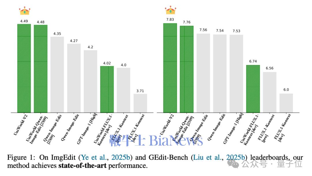 UniWorld-V2在GEdit-Bench和ImgEdit等行业权威基准测试中取得了SOTA成绩,在综合表现上超越了如OpenAI的GPT-Image-1等顶尖闭源模型。