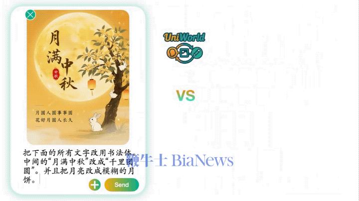 在论文的“海报编辑”示例中,模型能精准理解指令,并渲染出“月满中秋”和“月圆人圆事事圆”等笔画复杂的艺术中文字体,效果清晰、语义准确。