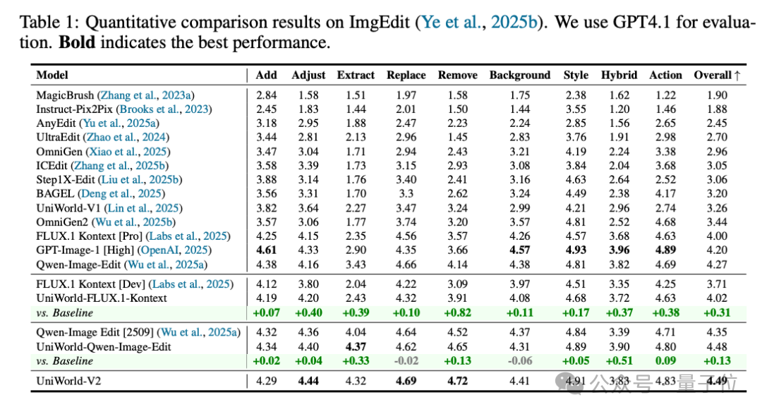 研究团队训练FLUX.1-Kontext [Dev]、Qwen-Image-Edit [2509]和UniWorld-V2作为基础模型,并采用ImgEdit和GEdit-Bench作为测试基准。前者将多种专门任务统一为一个通用框架以进行全面模型比较,后者通过丰富的自然语言指令评估通用图像编辑。