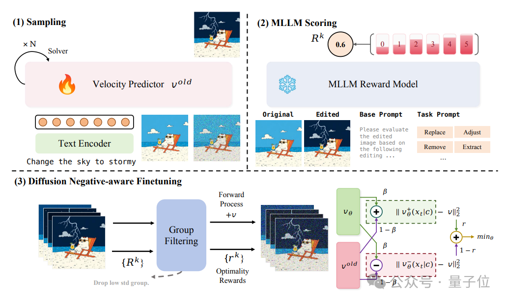 如下图所示,UniWorld-R1的pipeline主要包括三个部分:采样、MLLM评分和DiffusionNFT,这三个部分逐步将模型与最优策略对齐。