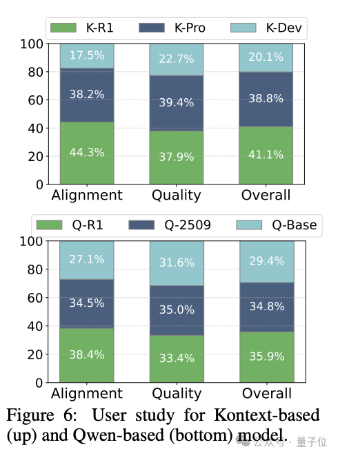 为了全面评估,研究人员还对FLUX.1和Qwen系列进行了人工偏好研究,参与者将本文的微调模型与其基础模型和更强大的版本进行比较。他们被要求在两个维度上选择最佳结果:指令对齐和图像质量。