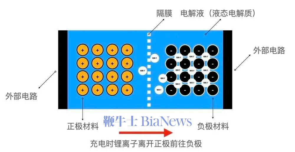 充电的时候,外界的电压驱使正极上的锂离子离开,经过电解质的传递,穿越隔膜,最终嵌入负极材料上。与此同时,电子也经由外部线路,从负极来到正极处。