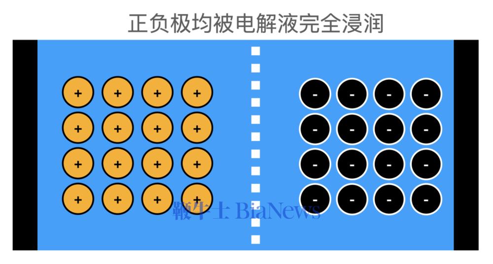 在液态电池里,正负两极都浸泡在液态的电解质中。在微观尺度下,我们会发现:液态电池的电极完全被电解液所浸润,彼此之间亲密无间,锂离子的通道畅通无阻。