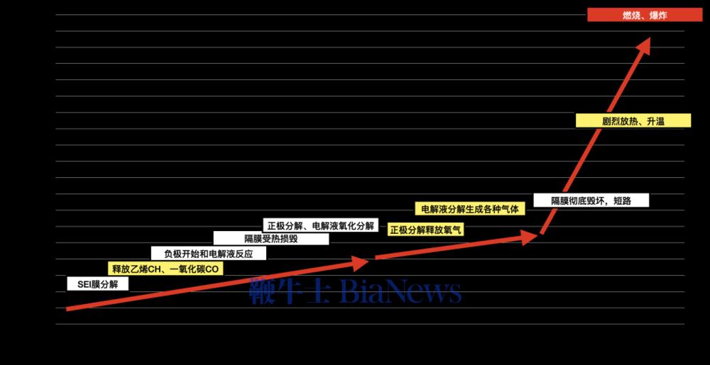 一旦电池进入热失控,电池内部就会引发各种连锁反应,甚至都不用很热,只要100多度就已经足够启动“毁灭之旅”了——110度左右,石墨负极就会开始和电解液反应,150度左右;隔膜就会融化,进而导致短路,温度急剧升高——电解质里的有机溶剂受热会分解出氢气、一氧化碳、甲烷、烃之类的易燃易爆气体,正极材料则会在高温下分解释放出大量的氧,只要温度再高一点点,就会导致剧烈的燃烧乃至爆炸。