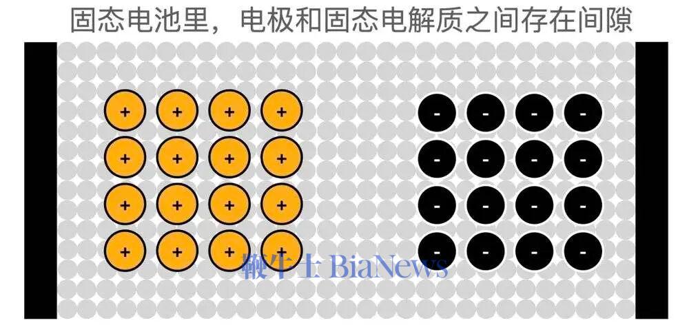 在固态电池里,固态的正负两极和固态的电解质之间看似密切贴合,实际不过是无数个“点接触”而已,根本没办法形成液态那样的“面接触”,锂离子的通道崎岖坎坷、并不通畅(所谓固-固界面阻抗高)。