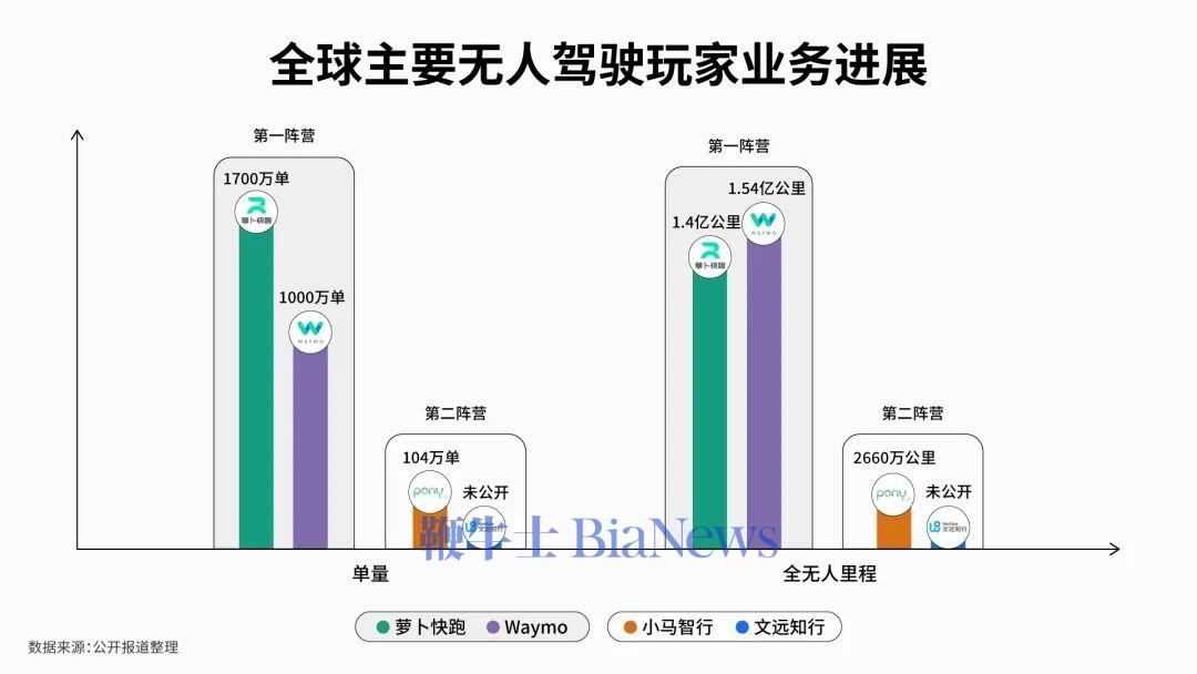 全球无人驾驶梯队清晰, 萝卜快跑绝对领先 李继伟丨作者 深潜atom工作室丨编辑 上市的钟声还未敲响,小马智行与文远知行已“互掐”近半年。从6月份小马高管暗指“文远技术落后两年半”、文远高管回击“小马智行不安全”,再到近日为港股IPO隔空对线,文远CFO发长文称小马路演资料诋毁文远…… 在这背后,是全球市场对无人驾驶行业的看好,资本市场也率先用真金白银投票。11月4日,百度集团港股开盘大涨6.2%;当天,美股中概股集体下跌,而百度收盘涨超3%。 背后核心驱动力源自旗下萝卜快跑披露的重磅运营数据——截至10月31日,其单周全无人驾驶订单首次突破25万单,累计服务订单量超1700万单,远超谷歌Waymo的1000万单。萝卜快跑无人驾驶车辆总行驶里程突破2.4亿公里,安全运营里程达1.4亿公里,与谷歌Waymo奠定了全球无人驾驶行业中绝对的领跑优势。