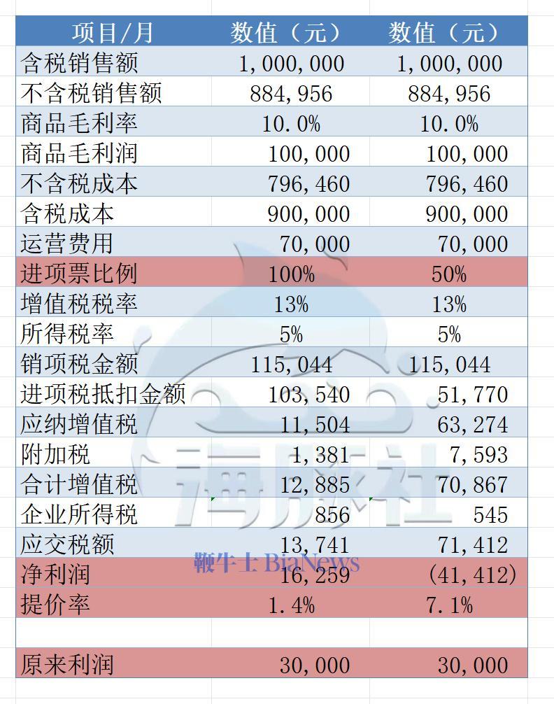 原本每个月实际有100万元的含税销售额,毛利率大概保持在10%。在新规实施之前,每个月会有3万元的净利润。
