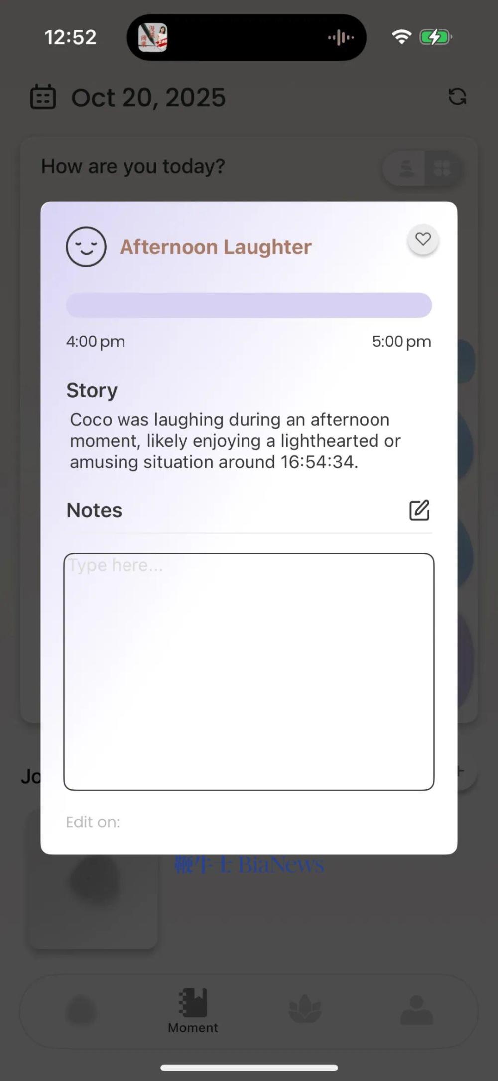 我点开了其中一个小罐罐,看到 Nuna 记录道,「下午某个时刻,可可在笑,大概是在 16:54:34 左右正享受着轻松愉快或有趣的情景。」