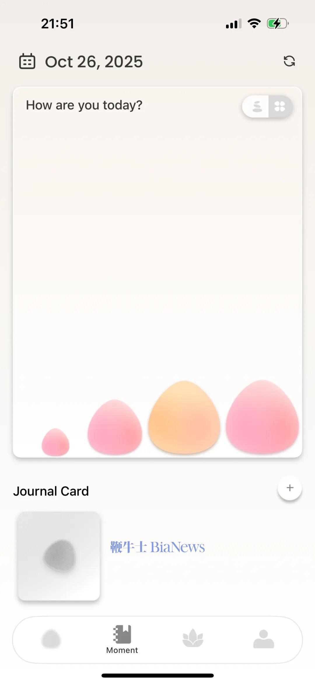 在 App 中,一个名为「Moment」的页面扮演了核心角色。它像一个「小罐罐」,每小时会自动掉落一个鹅卵石形状的「小球」。小球的颜色代表了你这一个小时的总体情绪状态。点开这个小球,用户不仅能看到情绪的变化曲线,还能看到「这一个小时里面发生的一些重要事件」。