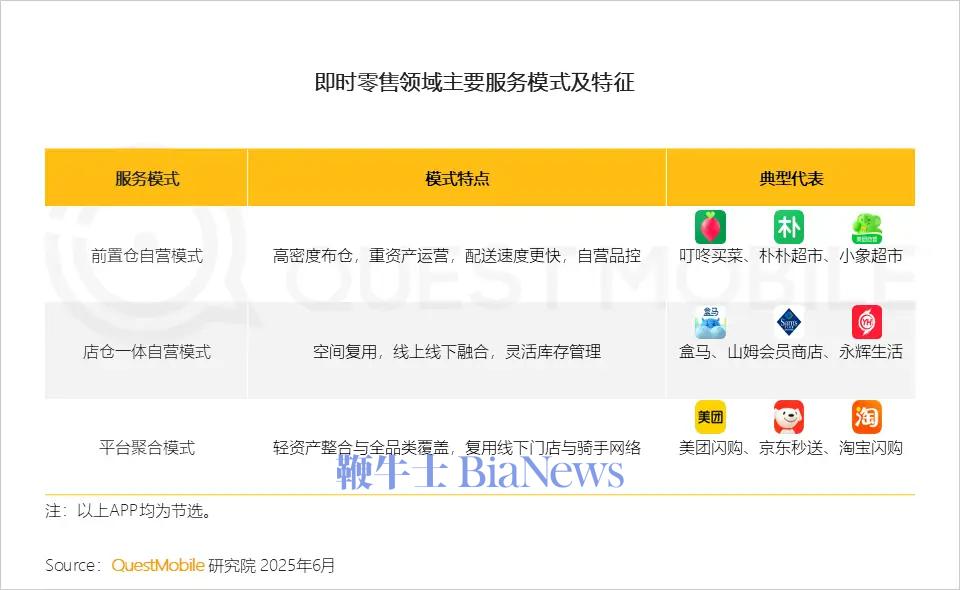 眼下,赛道分为三条路:以叮咚买菜、小象超市代表的前置仓自营模式;盒马、山姆会员店代表的店仓一体自营模式;以及美团闪购、京东秒送、淘宝闪购构成的平台聚合模式。后者正成为主战场,也是一切关于速度、规模的焦点所在,我们也将重点放在这一模式上。