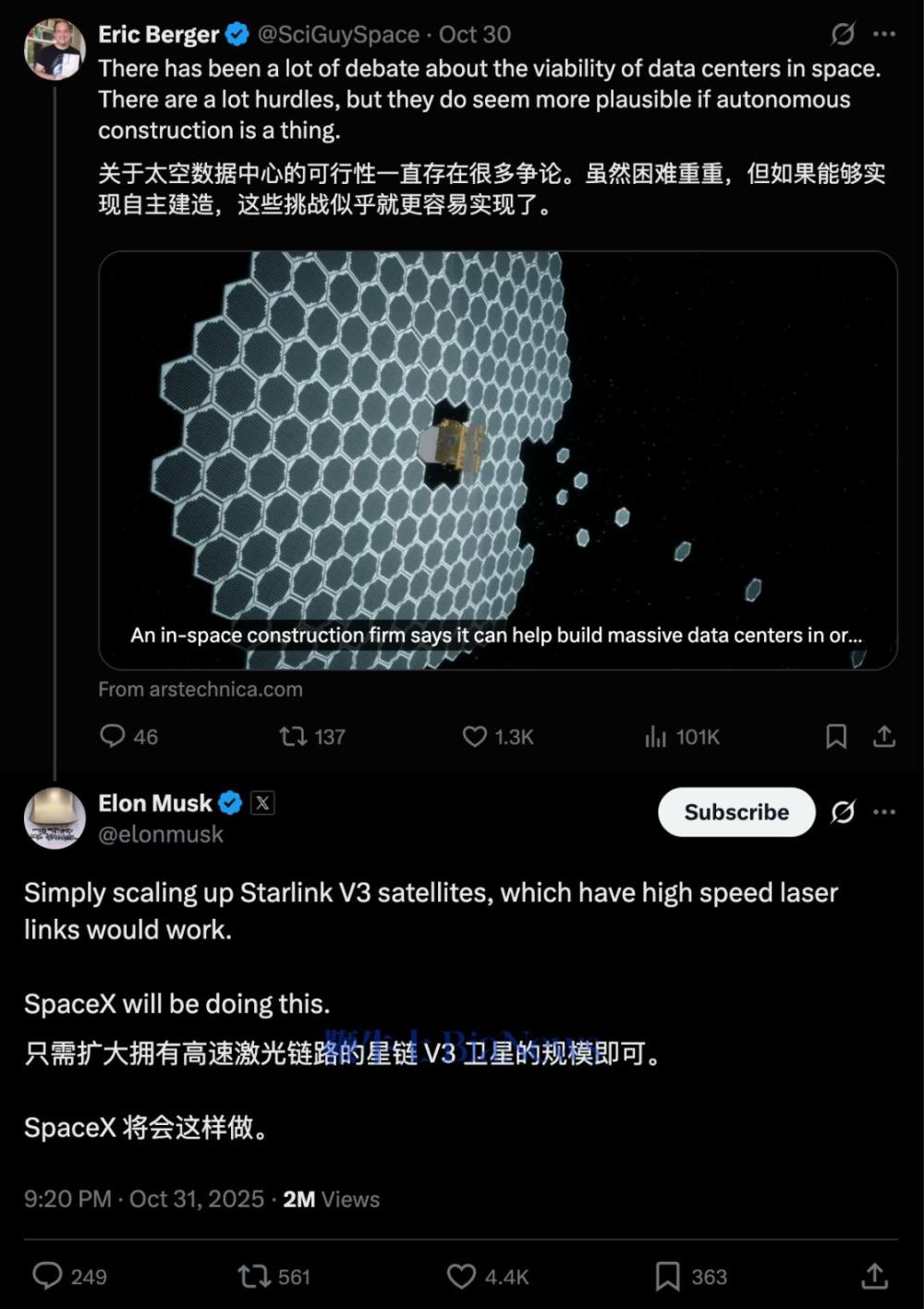 一块英伟达 H100 芯片的最高功耗可达到 700W,大约是家用微波炉的功耗,而一个数据中心的 H100 显卡数量是以万为单位,且不间断运行而就在最近五年,数据中心的需求开始狂飙,但增长速度已经远远超过了,规划新发电能力的速度。Google 为了解决同样的能源问题,他们的计划,是发射一个由太阳能驱动、搭载 Google 自研 TPU 芯片(用于计算,类似英伟达的 GPU)的卫星星座,在太空中组建一个「轨道 AI 数据中心」。8 倍效率: 如果搭载芯片的卫星,在正确的轨道上,太阳能板的效率是地球的 8 倍。7*24 不间断供电: 太空没有黑夜和云层,对比地球上的太阳能板,可以持续产生电力。零资源消耗: 在太空,数据中心不需要消耗地球有限的土地,也无需消耗大量水资源做冷却工作。苹果、华为、腾讯、以及移动等公司在贵州设立数据中心,图片来源:新华社目前地球上的数据中心,越来越接近能源瓶颈,建在冰岛、挪威,是为了冷;建在内华达沙漠,是为了电。像在国内,多数大厂的数据中心都放在贵州、宁夏中卫等,靠环境来降温。但是太空的环境,远比地球复杂。Google 在自己的研究论文里面,详细提到目前遇到的难点,以及用于应对的方法。AI 训练需要海量芯片协同作战,彼此间的连接带宽和延迟要求极高。在地球上我们可以用光纤实现数据的高速传输,在太空怎么办?他们计划让卫星「飞得非常近」,彼此相距仅公里级或更近。在他们一个 81 颗卫星的模拟星座中,每颗卫星都配有太阳能阵列、辐射冷却系统,以及高带宽光学通信模块;且卫星间的距离仅在 100-200 米之间动态变化。在如此近的距离上,它们可以通过自由空间光通信(FSO ISL,Free-Space Optical Inter-Satellite Links),实现高速互联。Google 在论文中透露,他们的演示已经成功实现了 1.6 Tbps 的双向传输速率。太空环境极其恶劣,太阳在提供能源的同时,也喷射出致命的高能粒子(辐射),这对尖端芯片直接是毁灭性打击。他们把自家的 Cloud TPU v6e (Trillium) 芯片送进了实验室,用 67 MeV 的质子束轰击它。结果是「惊人地抗辐射 (surprisingly radiation-hard)」,TPU 最敏感的高带宽内存 (HBM),在承受了 2 krad(Si) 的剂量后才开始出现异常,这几乎是 5 年任务预期辐射剂量(750 rad(Si))的近 3 倍。这意味着 Google 的 TPU 可在低地轨道连续运行 5 年,无永久损伤。Google 计划在 2027 年前与 Planet 公司合作,发射两颗原型卫星,测试实际运行环境。Planet 公司官网,主要从事卫星图像和地球数据的分析在太空上,各个 GPU 之间的数据传输是做到了快速高效,但是就算在太空算完了,数据怎么高速传回地球?这是一个 Google 在论文中承认、尚待解决的重大挑战。延迟问题: Google 选择的「晨昏同步轨道」,虽然太阳能拉满,但论文承认这将会增加到某些地面位置的延迟。带宽瓶颈: 目前的「地-空」光通信的最高纪录,还是 NASA 在 2023 年创下的 200 Gbps。200 Gbps 听起来很快,但对于一个太空 AI 数据中心来说,这根水管远远不够用。然而,在所有这些(局域网、辐射、地面通信)高难度的技术挑战之上,还压着一个最根本、最致命的障碍,它决定了前面的一切是否值得去解决,上天成本。这曾是最大的障碍,把一公斤重的东西送上天,曾经比同等重量的黄金还贵。Google 在论文中计算过一笔账,如果 SpaceX 的发射成本能降到 $200/kg(预计 2035 年左右),则太空数据中心的单位功率成本,能与地面数据中心持平,约 $810/kW/年,与美国本土数据中心的 $570–3000/kW/年区间完全重叠。换句话说,当火箭便宜到一定程度,太空就会比地球更适合建数据中心。然而,现实是目前的发射价格,是这个理想价格的十倍以上。Google 在他们的论文里,明确采用了 SpaceX 的学习曲线假设:每当总发射质量翻倍,单位发射成本下降 20%。自首次成功发射猎鹰 Falcon 1 号以来,按最低实现价格计算的 SpaceX 有效载荷质量,针对不同类别火箭逐步变化从 Falcon 1 到 Falcon Heavy,SpaceX 已把发射成本从 $30000/kg 降到 $1800/kg;而 Starship 的目标,是 10× 可重复使用率下的 $60/kg,极限情况下可降到 $15/kg。这意味着,SpaceX 很有可能成为支撑 Google 太空数据中心经济模型的公司。如果说英伟达垄断了地球上的 GPU,那么 SpaceX,将来就可能垄断太空中的算力空间。在地球上,英伟达卖 GPU;在太空里,SpaceX 卖轨道。就在 Google 发布论文的几天前,11 月 2 日,英伟达强大的 H100 GPU 已经「首次」被送入太空。这颗 H100 被搭载在一家名为 Starcloud 的初创公司的卫星上,其在轨算力比以往任何太空计算机强 100 倍。Starcloud 创办于 2024 年,诞生之初就是致力于在太空建立数据中心,获得了英伟达、YC 等投资。它们的任务更直接,在轨实时处理数据。Starcloud 的 CEO 举例:一颗 SAR(雷达成像)卫星的原始数据极其庞大,与其下载数百 GB 的原始数据,不如在轨用 H100 分析,只传回 1KB 大小的结果,比如「一艘船在某位置,速度 多少」。而当被问到这一切如何实现时,Starcloud 的 CEO 同样指向了马斯克:他们的愿景,完全依赖于「SpaceX Starship 带来的成本降低」。搭载了英伟达 H100 GPU 的 Starcloud-1 卫星,正是通过马斯克的 SpaceX,Bandwagon 4 Falcon 9 航班发射升空的。过去五年,英伟达一次次刷新最高市值记录,关键在于它提供了最强的算力单元(GPU);它掌控了 CUDA(英伟达通用计算平台)生态,形成软件锁定;它成为所有 AI 公司(OpenAI、Anthropic、Google)的算力上游。而在太空算力时代,这三点都可能都将被重新分配,