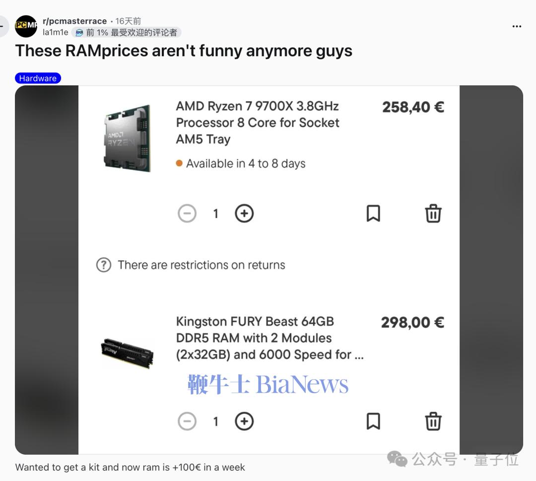 Reddit上有网友吐槽,自己攒了几个月的钱想买的内存,一看价格竟然几乎翻倍。