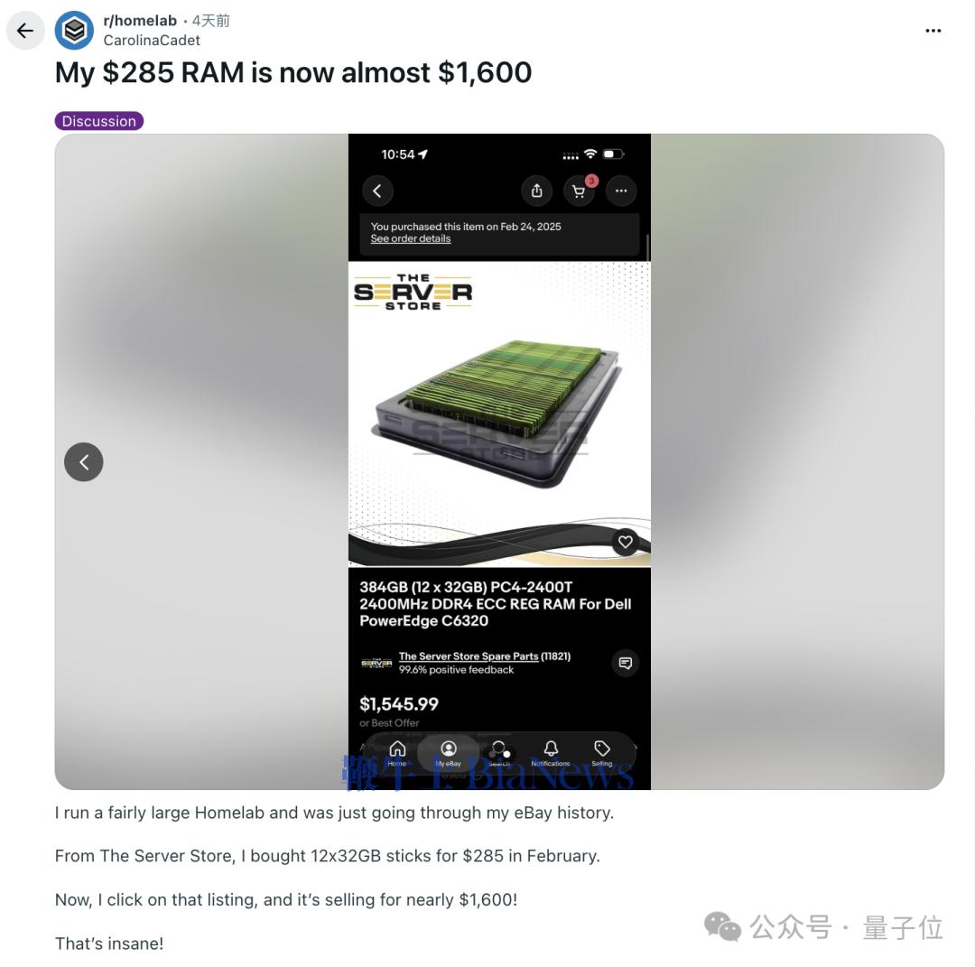 个人之间的交易涨价更加离谱,有网友表示自己花285美元在eBay买的的内存套组,现在价格接近1600美元,相当于涨了4倍多。