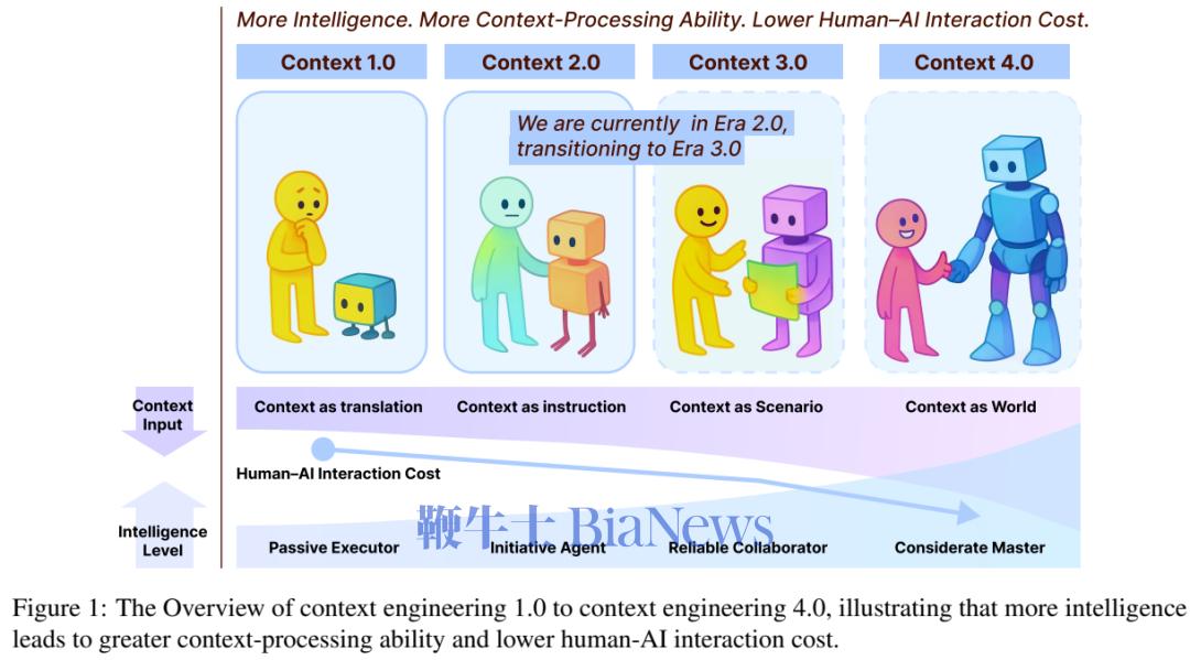 这项研究通过回溯上下文系统的演化历史,结合大量系统实验与理论建模,提出了“上下文工程”(Context Engineering)这一全新学科框架。团队发现,从早期依赖传感器和规则的 Context 1.0,到能够跨模态理解语义的智能体 2.0,AI 的每一次跃迁,都是一次对“语境吸收力”的升级。