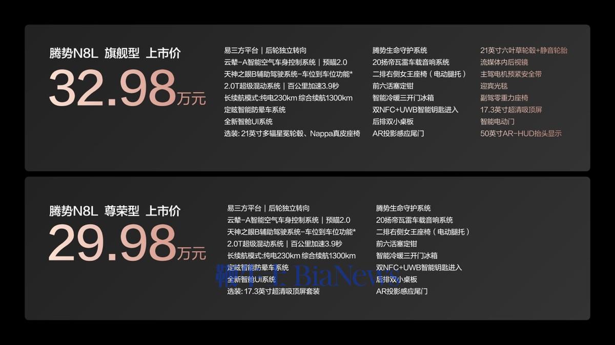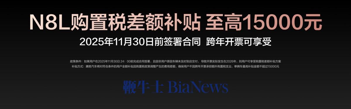 腾势N8L售价为29.98万元-32.98万元,上市以来持续热销,为回馈用户厚爱,推出限时购车权益,价值至高达10.67万元!包括价值1.7万元的三年免息,最高1万元的置换补贴。此外,在2025年11月30日24点前完成合同签署的用户,如果因非用户原因车辆未及时交付,导致开票实际发生在2026年,可享受购置税差额补贴,最高1.5万元!用户不必担心因为交车晚,而享受不到购置税补贴。