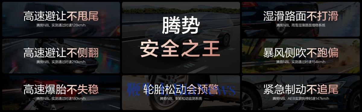 主动安全方面,得益于易三方,腾势N8L能够以128km/h高速避让不甩尾、210km/h高速避让(鱼钩测试)不侧翻、180km/h高速爆胎不失稳、154km/h暴风侧吹不跑偏、147km/h AEB自动紧急制动、不怕雨雪路面打滑、车轮松动监测系统,以科技安全守护家人出行安心。腾势汽车不愧被称为新能源汽车的“安全之王”。