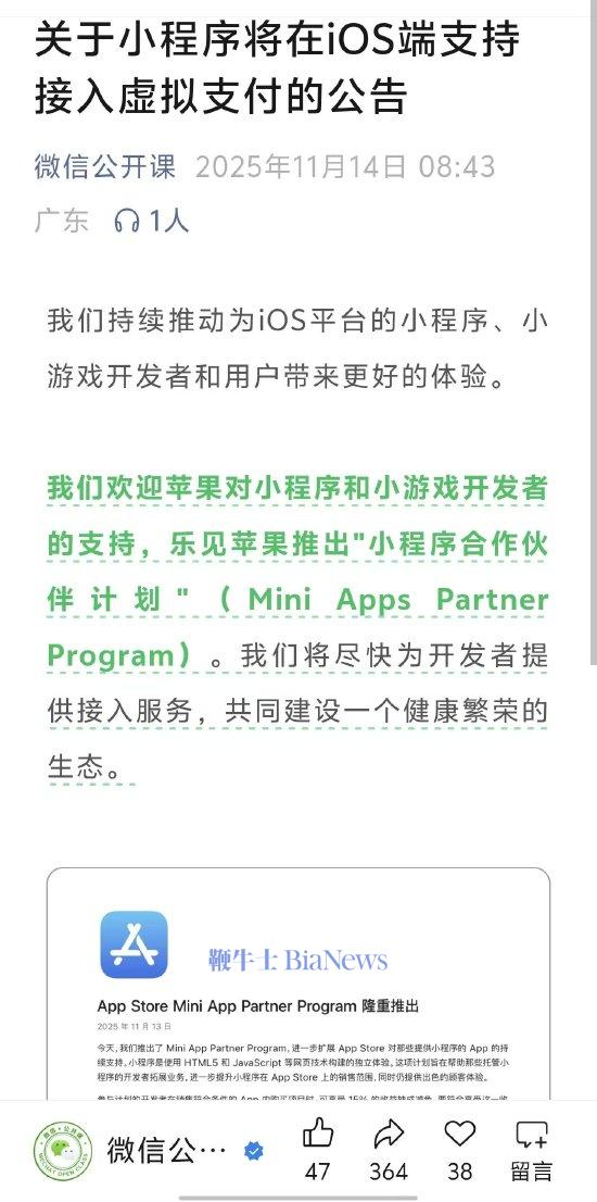 微信官方还表示,我们欢迎苹果对小程序和小游戏开发者的支持,乐见苹果推出“小程序合作伙伴计划”(Mini Apps Partner Program)。我们将尽快为开发者提供接入服务,共同建设一个健康繁荣的生态。