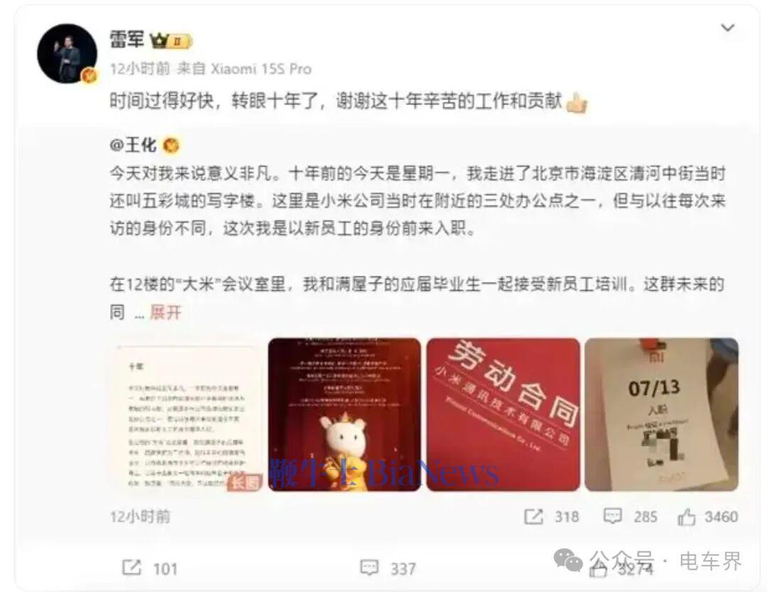 王化职业成长轨迹与小米的扩张历程高度契合,也是小米对外发声、处理舆论的核心人物之一。入职十年时,还获雷军亲自留言感谢其工作与贡献。