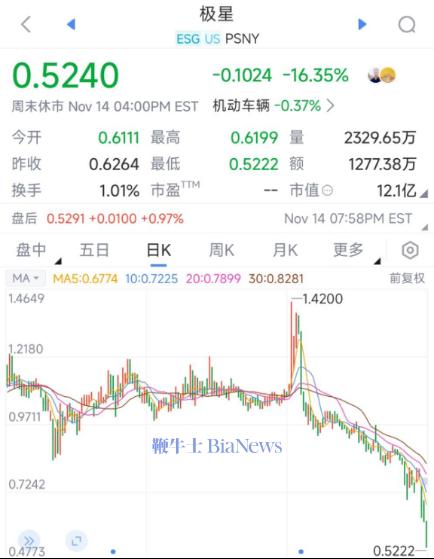 回望极星汽车的上市历程,2022年6月24日,极星首次登陆纳斯达克。仅仅三年半时间,极星汽车的股价已经从13美元跌至约0.5美元,累计跌幅达94.4%。
