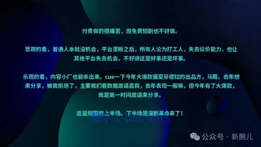 今天的嘉宾PPT都非常精彩,和漫剧相关的内容,我的标题是《漫剧革命》,经过这段时间的调研和了解,发现整个市场已经全部向漫剧靠拢,短剧好像没有那么吃香了。