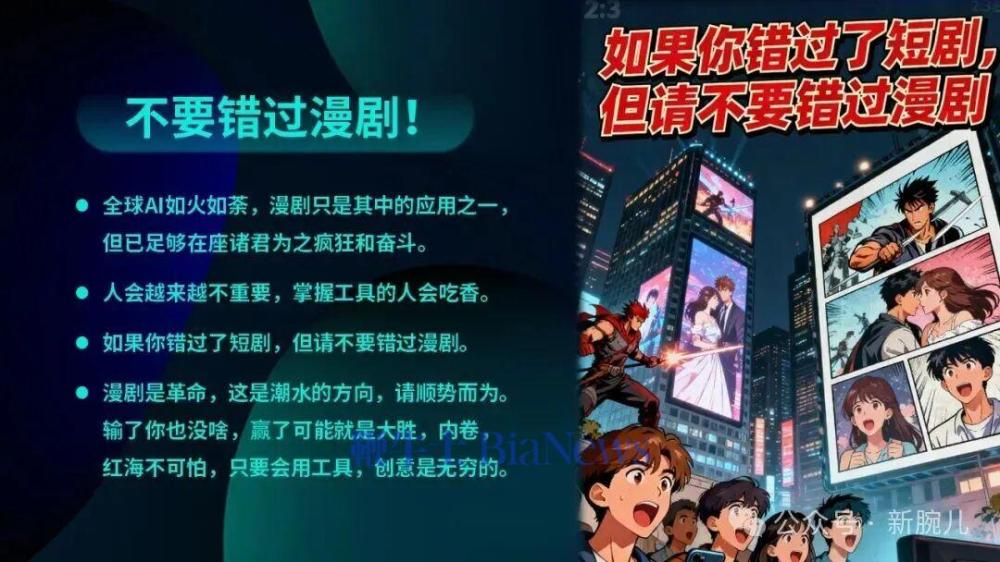 去年短剧会把长剧做一遍,今年漫剧会把短剧和长剧都做一遍,这是非常难得的机会,也是一个风口,是一个剧开源的源代码。漫剧和AI结合会诞生出非常多可能,成本会降低,创意无穷,现在做短剧的从业者可能会被掌握AI工具和能力的人颠覆。
