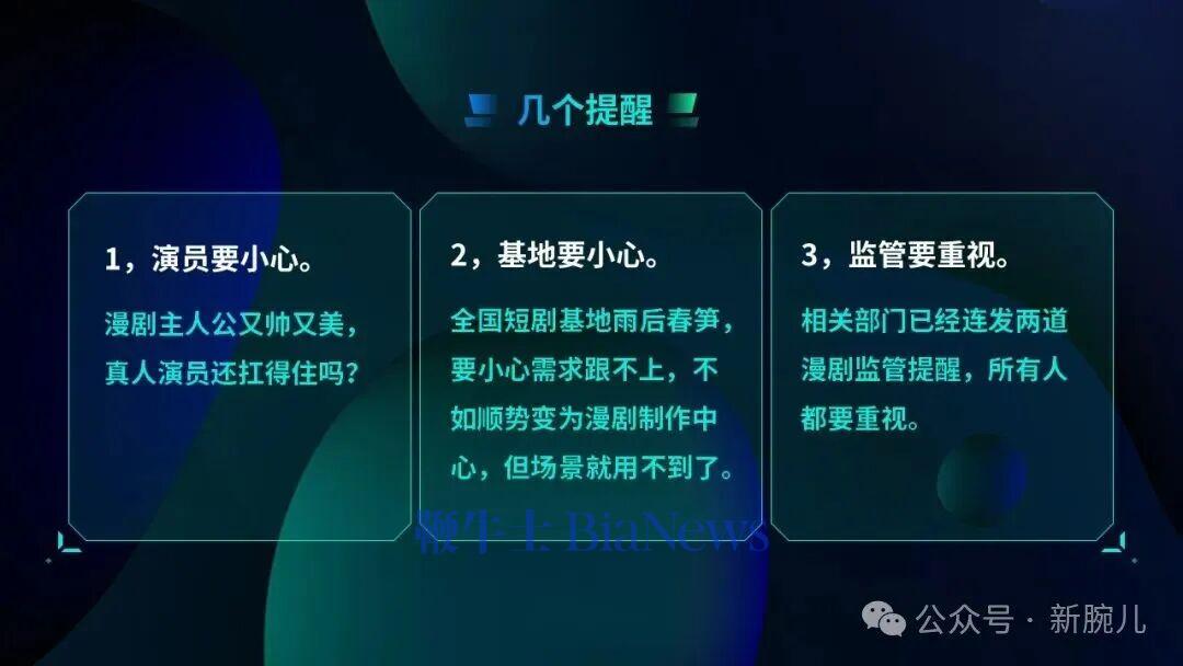 最后,我有三个小提醒:演员,明年真人短剧会不会就不香了?有这种可能。第二,基地要小心,基地听完今天的课以后,要好好想想如何转向AIGC,如何转向漫剧的制作,因为现在真人确实没有那么火了,这是对基地的提醒。第三,重视监管,目前对漫剧已经发了好几道监管提醒,这是所有从业者都要注意的事情。
