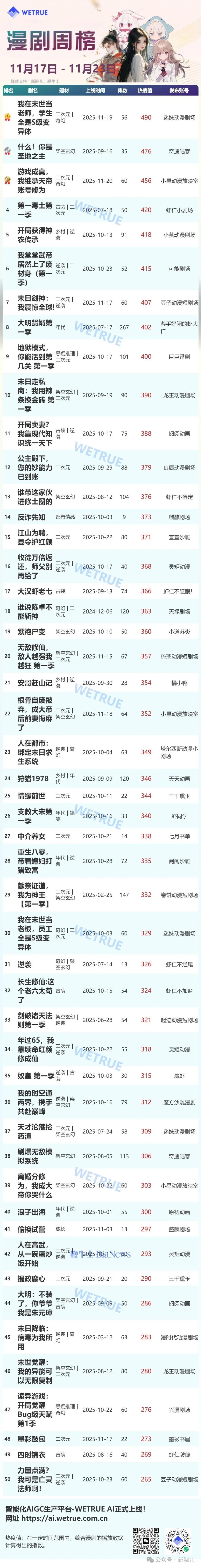 11月第3周漫剧周榜:《我在末世当老师,学生全是S级变异体》第一