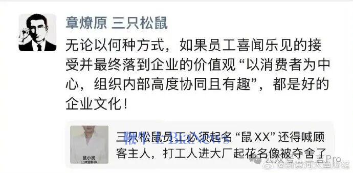 几乎每个员工都取个带“鼠”字的花名,连公司CEO和老板娘也不例外。支部也是全体鼠名,“鼠政委”、“鼠守一”、“鼠周到”、“鼠蛋蛋”、“鼠妖孽”、“鼠麻瓜”……不过其中还有一只英文鼠-鼠Emma,网友猜测这是留学鼠。三只松鼠还称办公楼为“鼠窝”,外观设计很像一个松鼠窝。网友各种玩梗、取名,比如财务叫鼠发票、鼠发财。有人给HR取名鼠贩子。不过好像他们真有HR叫鼠惜才、鼠爱才。还有前员工在评论区吃瓜,被其他网友调侃:抓到一只已化成人形鼠。除了花名鼠化,连岗位名称也鼠名化,比如“客服鼠”、“发货鼠”、退货专员叫“退货鼠”。不过,因“退货鼠”是“退货死”谐音,有消费者认为遭到冒犯。事实上,平时客服把消费者称为主人,有些人认为这可能有矮化员工的嫌疑。虽然都是鼠名,老板、老板娘是“松鼠老X”,而员工们只能“鼠”字开头。有人质疑称松鼠和鼠可不是一样,一个“鼠辈”,一个是“松鼠辈”。面对流量以及质疑,三只松鼠创始人、CEO章燎原第一时发声,“无论以何种方式,如果员工喜闻乐见地接受并最终落到企业的价值观,以消费者为中心,组织内部高度协同且有趣,都是好的企业文化!”三只松鼠还强调入职改鼠名并不是强制的,员工可自愿接受,不改也不会有任何后果。三只松鼠也赶紧抓住了这波流量,官方账号推出了参观总部的活动,并自曝公司的各种鼠文化。三言观察到三只松鼠的这波鼠文化出圈,总体上网友的评价是偏正面的,大部分都喜闻乐见这种形式,很多人玩梗玩得不亦乐乎。大家对于花名文化并不陌生,这几乎是互联网大厂的标配。其实花名文化本质是为了平等和扁平化沟通,不用哥呀姐呀的称呼,也不用记各种领导头衔,大家都可以直呼其名,挺好的。另外花名也有增加企业文化的作用,比如某大厂的武侠花名风格,大家一听就知道。又比如某大厂的花名制度以水果蔬菜类命名为主,也挺有意思。而三只松鼠的花名选择了公司名称中的鼠,也具有很强的文化属性。相比其他企业的花名,三只松鼠的花名制度更加极致,限制更多,必须带鼠字。鼠名的好处显而易见,但也有些局限。比如鼠很容易被联想到老鼠,有被误解的可能。再个,每个名字都带鼠,员工一多取名就可能犯难。花名虽然更多是对内使用,但三只松鼠的鼠名不止局限于内部,这部分的鼠名更应该慎重一点,尽量避免争议。(转载自三言Pro)
