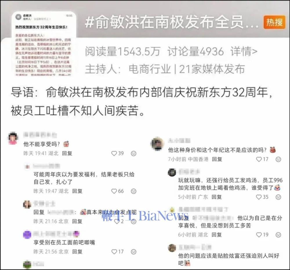 俞敏洪想不到,那封发自南极的情怀满满的信,竟成了公关危机的引爆点;但员工们可能也想不到,一句老板“鸡汤”无福消受,长假福利却悄然到账。11月20日和23日,新东方董事长俞敏洪两次在社交平台发文回应自己此前在南极发布全员信被吐槽一事,称“尽管有人骂我‘老登’,我还是要啰嗦几句”“老板也在拼命工作”,明年将选10个左右的基层优秀员工游南极。
