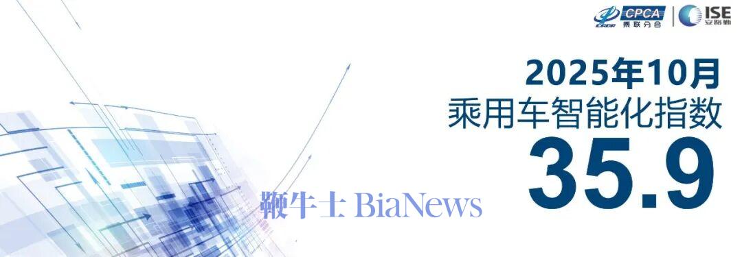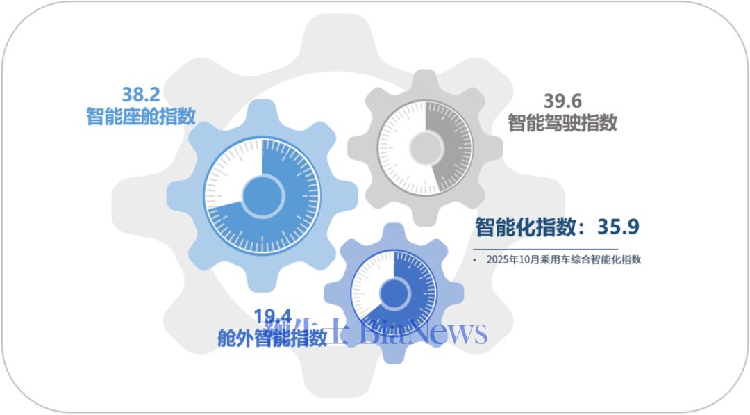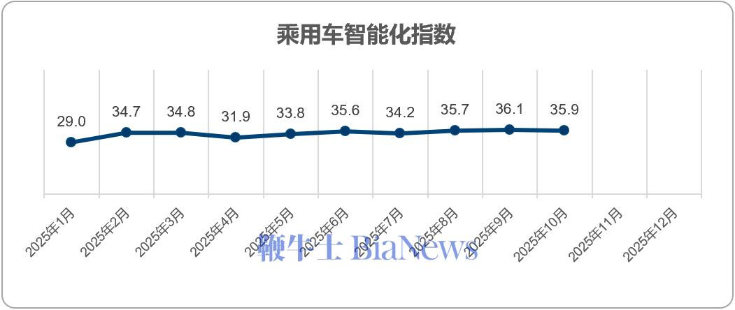 2025年10月乘用车智能化指数为35.9。其中智能座舱指数为38.2;智能驾驶指数为39.6;舱外智能指数为19.4。