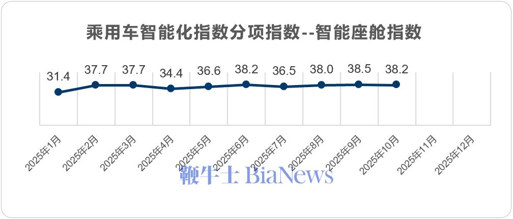 2025年10月,智能座舱指数38.2,环比下降了0.3个单位,出现小幅回调。