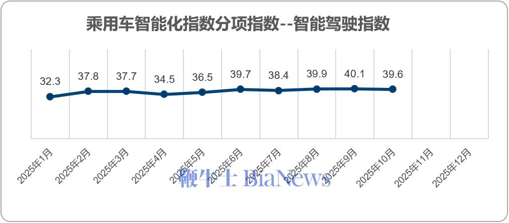 2025年10月,智能驾驶指数39.6,环比下降了0.5个单位,增长趋势放缓。