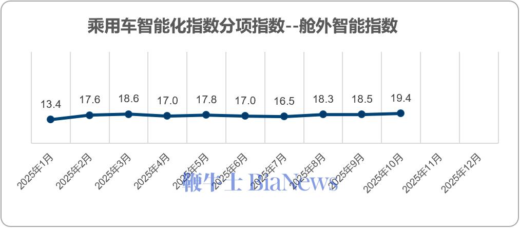 2025年10月,舱外智能指数19.4,环比增长了0.9个单位,整体保持增长趋势。