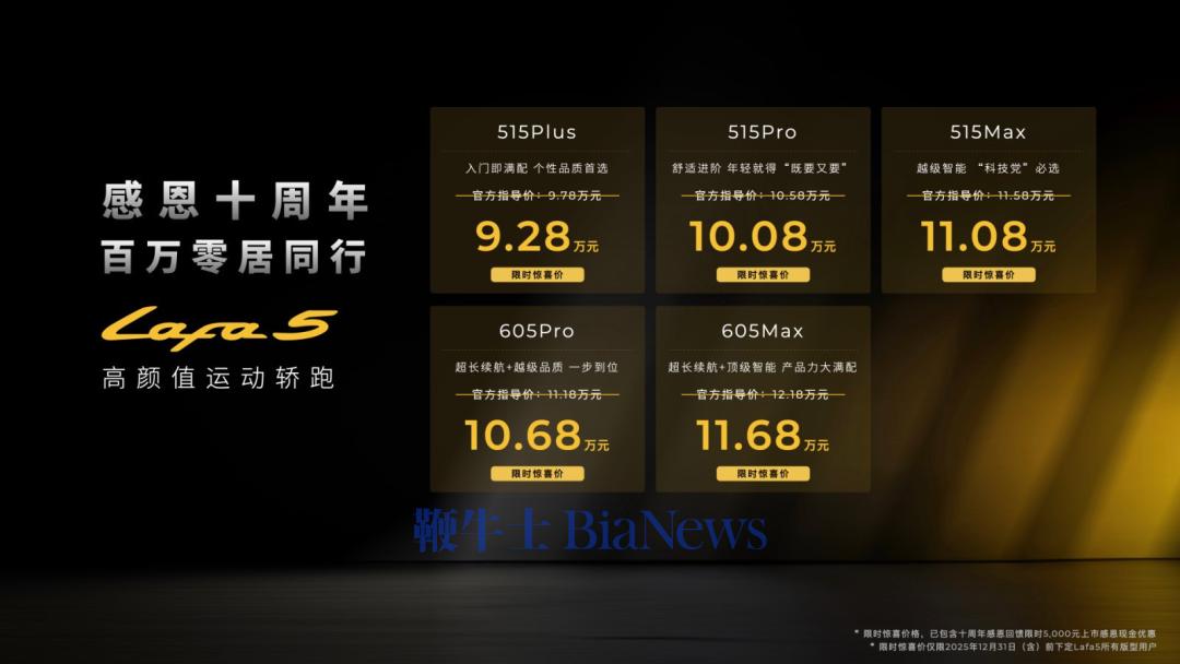 惊喜还在后头,Lafa5 首销期还同步推出 5000 元限时优惠,这也意味着入门的 515Plus 版本直接干到了9.28 万,顶配 605Max 版本也仅11.68 万。 虽然月销都飚到7万台了,但零跑还是那个“便宜大碗”的零跑,不到12万的预算,你能买到高通 8650+8295P驾舱芯片组合,还有一颗激光雷达,605km续航里程的小钢炮。 更关键的是,这款车还有很大的改装潜力,妥妥的电动高尔夫。 对于这个定价,朱江明坦言压力并不小,在会后的采访中强调这款车的高成本与定价非常困难,最后还是决定拿出「在成本定价的基础上更进一步的诚意」。 01 武斩GTI 正式发布前,零跑汽车高级副总裁曹力开场先是介绍了“Lafa”这个名字的含义: L是Lifestyle,关乎生活方式;A是Attitude,彰显个性态度;F是Freedom,实现自由掌控;A是Art,契合潮流审美。 显然都是一些赋予情绪价值的词汇,其实无外乎三点,好看、好开、好玩,这也契合一台“小钢炮”的定位。 其实在国内市场,造一台“两厢车”是一个很不讨巧的选择,气场不如轿车足,空间不如SUV实惠,还有先天的硬伤,电车因为电池包的存在,车身姿态会和车型定位并不匹配。 如果没有些真本事,零跑也不会选择造这么台车。 外观方面,零跑Lafa5在目前零跑汽车家族的设计语言做了区分,在车身长度只有 4430mm的情况下,车宽却达到了1880mm,这一数据超过了不少中型 SUV。 越级的车宽带来的好处显而易见,一是视觉上更低趴,配合 19 寸的轮毂,有了小钢炮该有的姿态,透着一股不好惹的“赛道味”。 其次是解决了两厢车后排坐三人时略显拥挤的痛点,按照零跑的说法,有着同级最宽的后排空间,肩部空间能达到 1401mm,媲美凯美瑞,坐在后排,你很难相信这只是一辆 4.4 米的小车。 还全系标配了无边框车门和19寸运动轮毂,让车辆更具运动属性,同时,Lafa5还拥有过去车型不常见的个性化车漆,比如电擎黄、星夜蓝、摩根粉等。 另外就是“好开”,单一个词汇其实包含了多个维度,光动力强还不行,底盘操控也要跟得上,更开的久。 零跑Lafa5采用后置后驱布局,搭载七合一高性能油冷电驱系统,除入门版电机最大功率是132kW外,其余车型电机最大功率均为160kW,峰值扭矩 240N·m,最快零百加速能达到6.4秒。这个数据虽然算不上狂暴,在燃油车里,这一加速水平足以达到了“小钢炮”的标准,已经比高尔夫GTI的6.9秒还要快。 不过,相信在2026年第二季度推出的Ultra版,会有更强的动力。 底盘则由零跑与Stellantis集团联合调校,采用了前后双独立悬架,有着前后50:50的黄金轴荷比,再加上近1.9m的车宽,让这辆车在过弯时有了难得的操控性。 零跑Lafa5还上车了LMC一体化运动融合控制技术,可以实现120km/h下的爆胎稳定控制,动态转向辅助等,这也让零跑Lafa5也相当灵活,转弯半径仅5.17米,还有全景影像和透明底盘功能辅助,另外还可以提供多种驾驶模式与弹射模式选项。 续航方面,Lafa5的CLTC纯电续航分别为515km和605km,充电速度也不慢,30%-80%充电仅需18分钟,能耗方面,在全系搭载热泵空调以及全车低至0.256的基础下,百公里电耗仅为12.3kWh。 02 文能通勤 虽然是台小钢炮,但也要坐的舒服,零跑表示,Lafa 5 有着61.4% 的轴长比和 86% 的空间利用率,在乘坐空间上得以保证,座椅还都用了超纤绒+Nappa拼接。 至于在“好玩”的属性上,零跑一直有个降维打击的优势,将高阶的智驾和智舱打入不敢想象的价格区间。 Lafa5上也是如此,Lafa5车机标配了5nm工艺的高通8295P芯片,配备14.6英寸悬浮式2.5K高清中控屏与8.8英寸液晶仪表,配合这颗芯片的是 Leapmotor OS 4.0 Plus 系统同时接入DeepSeek和通义千问双大模型,支持多意图对话、声纹识别及离线控制。 辅助辅助方面,配备包含一颗激光雷达在内的27个智能感知硬件和高通8650芯片的加持,等效算力能达到200TOPS,零跑Lafa5可以实现26项智能辅助驾驶功能,包括高速和城市通勤领航辅助,未来还可通过OTA升级城区领航功能。 能在10万元出头的两厢小钢炮聊高阶的辅助驾驶,是过去不敢想的事情。另外,零跑Lafa5还支持HPA停车场记忆泊车,可以做到跨楼层的泊车辅助,且一次学习即可记忆。 配合辅助驾驶系统,零跑Lafa5还设计了6处辅助驾驶小蓝灯,分别位于前脸、外后视镜和车尾。 与之前的B系列一样,零跑Lafa5拥有6个魔术拓展坞,用户可以根据自己的需求来自由搭配,零跑汽车官方也提供了30多款精品配件。 全系标配12扬声器系统,基于零跑自研的AI音效算法,低音瞬态增强50%、全频段清晰度提升80%、人声分离度达3倍,无麦K歌也能搭配光影、动感、卡农三种律动氛围灯,车顶麦克风 + 智能降噪技术让座舱秒变LiveHouse。 03 百万销量的起点 聊完参数,再聊聊Lafa 5即将面对的市场。 在发布会后,零跑汽车创始人、董事长兼CEO朱江明、零跑汽车执行董事兼高级副总裁曹力、零跑汽车副总裁周颖接受了超电实验室在内的众多媒体的对话,对零跑的产品定义和规划进行了详细的解读。 在许多人看来,主打个性化和运动的车型,受众群体往往较小,因此这类产品会被打上”小众“的标签,朱江明在现场还反思了零跑的第一款车——S01。正是因为有S01的不成功,才让零跑意识到,产品规划、定义和投放节奏的重要性,也正是这款车给了零跑太多的经验和教训,才会成就今天的零跑。 而在朱江明看来,汽车消费趋向年轻化,汽车内卷愈发严重的今天,零跑有必要跳出内卷做年轻个性化的产品。 周颖也直言,“Lafa 5 在细分市场里面我