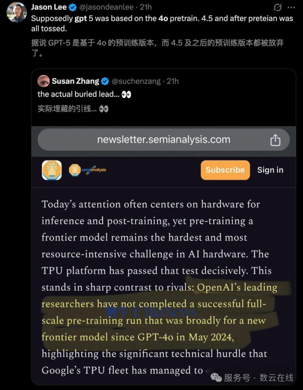 「GPT-5的基石还是GPT-4o,甚至GPT-4.5之后的预训练版本全被砍了!」这个听起来耸人听闻的说法,可不是空穴来风——爆料源头是业内权威机构SemiAnalysis的最新报告,直接扒了OpenAI的底裤。