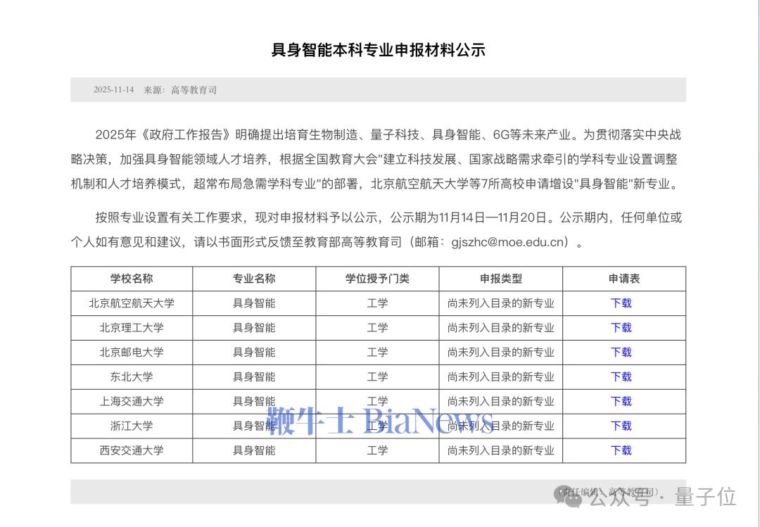 除了上交,在教育部高等教育司最近发布的公告中,我们也可以发现,包含上交在内的,北航、北理、北邮、东北大学、浙大、西交、哈工大、南航等9所高校都在陆续申报具身智能本科专业。