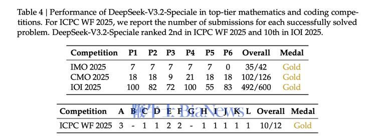 这次发布的两个模型正是这条路线的产物,V3.2定位日常主力,对标GPT-5;Speciale定位极限推理,对标Gemini 3.0 Pro,并拿下四枚国际竞赛金牌。