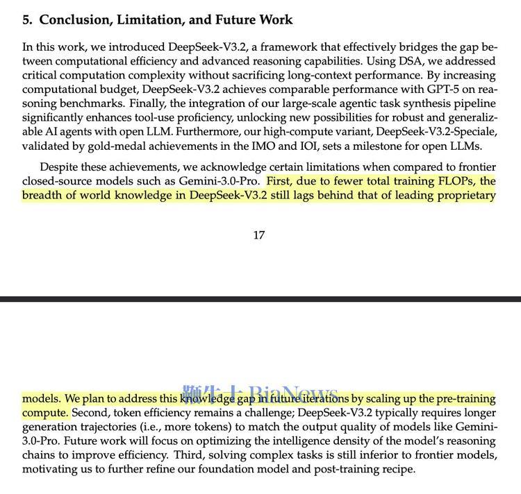 有网友评论说,每篇DeepSeek论文最重要的部分永远是“结论、局限性与未来工作”部分。这次的技术报告也不例外,他们说:“首先,由于总训练FLOPs较少,DeepSeek-V3.2 的世界知识广度仍落后于领先的闭源模型。我们计划在后续版本中,通过扩大预训练算力来弥补这一知识差距。”