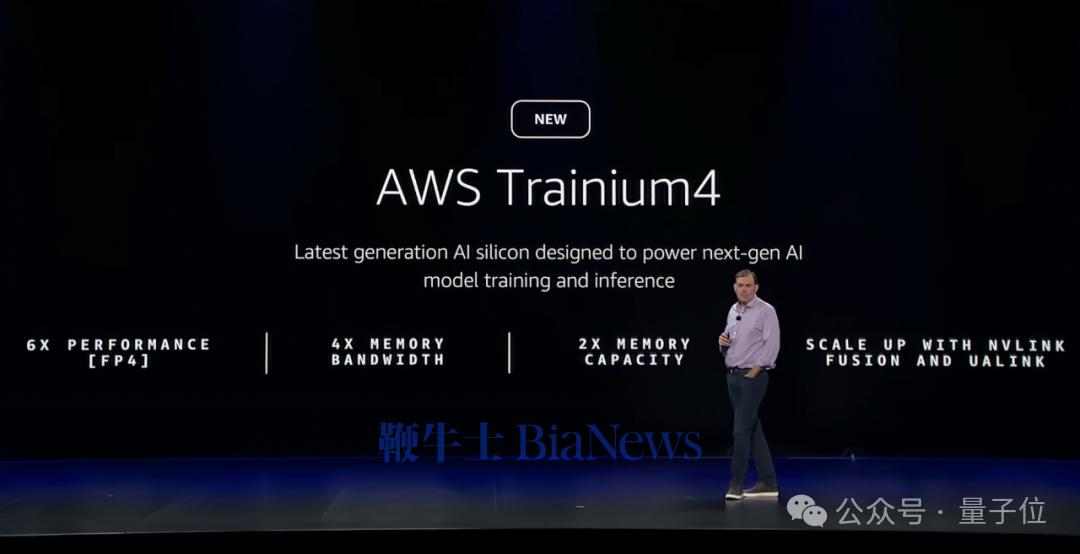 根据Garman介绍,Trainium4相较于上一代,将带来每个维度上的巨大飞跃:FP4计算性能提升6倍,内存带宽提升4倍,并拥有2倍于前代的高带宽内存容量,专为全球最大的模型训练需求而生。
