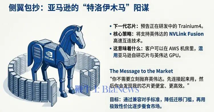如果说Trainium3是正面强攻,那么亚马逊对下一代芯片Trainium4的预告,则是一记精妙的“侧翼包抄”。