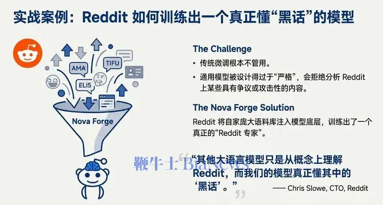 Reddit首席技术官克里斯·斯洛维(Chris Slowe)表示,传统的微调根本不管用,因为大多数通用模型被设计得过于“严格”,会拒绝分析Reddit上某些具有争议或攻击性的内容。但通过Nova Forge,Reddit将自家庞大语料库注入模型底层,训练出了一个真正的“Reddit专家”。