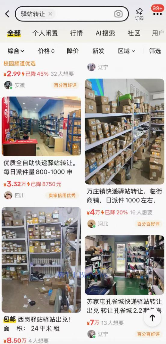 你再上闲鱼等平台搜搜,多的是驿站转让的帖子,附带的描述大多是“接手即盈利”“高派费”“驿站稳定,几乎无问题件”。。。