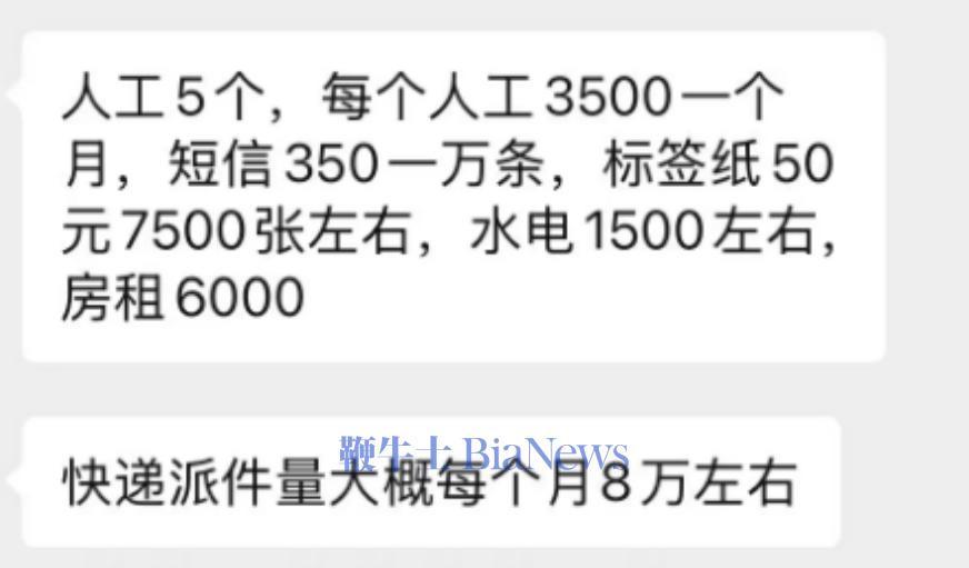 浩浩给我们算了一笔账,他们店里5个人工,每月人工成本17500元,还要算上房租6000元、水电1500元,以及350元/万条的短信费和50元/7500张的标签纸。