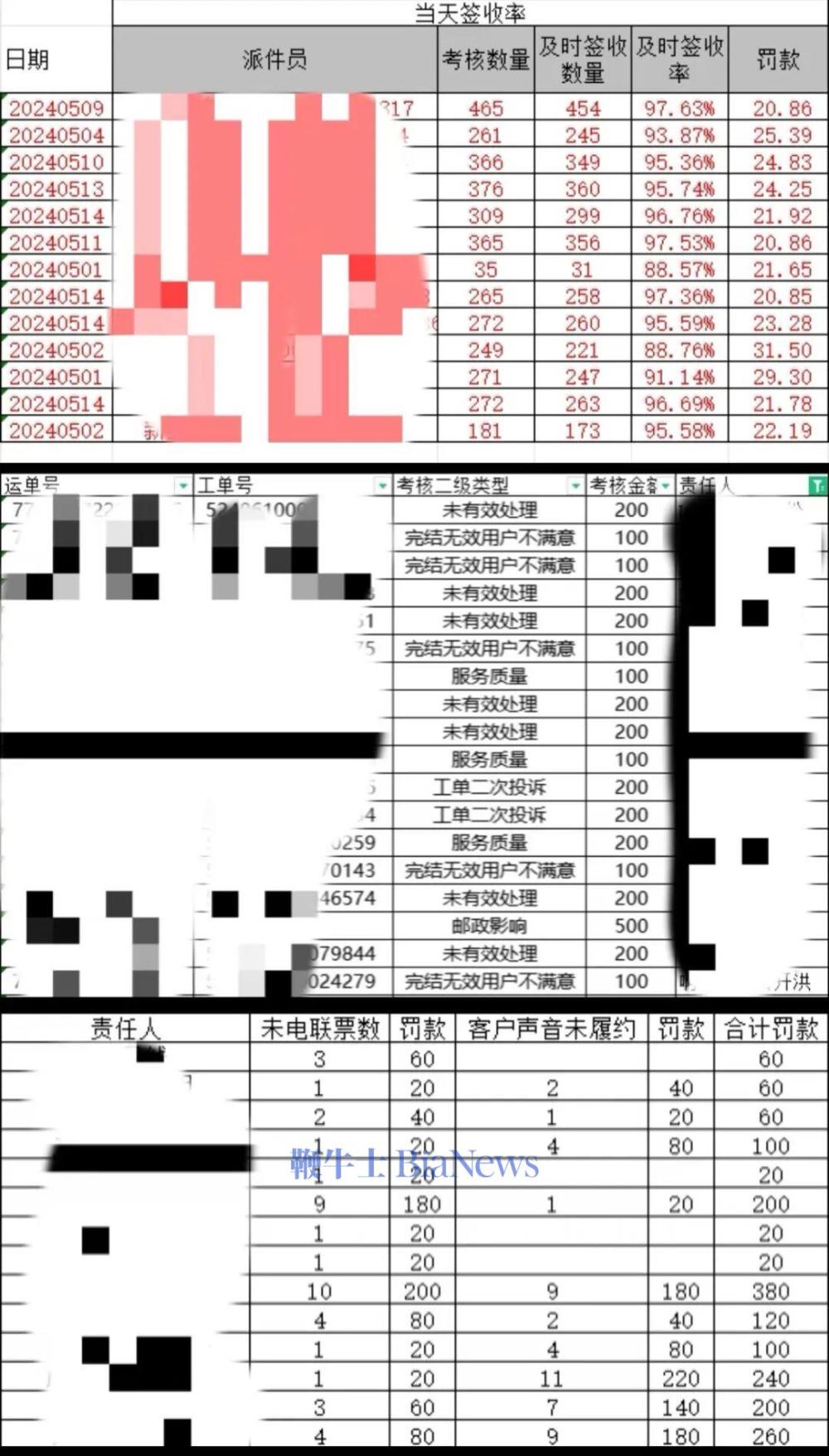 我们了解到,表单里的那些罚款项目还只是一部分,快递公司的罚款类目繁多,遗失、破损和延误都算常规的,像什么9xxxx回拨未接扣50块,一个投诉200-500不等,就连咱们正常打客服电话问快递送到哪了,也会变成罚款。