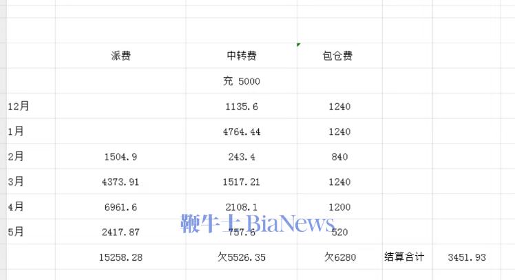 但经历了考核扣派费,扣税、扣管理费、扣罚款这么几道流程下来,只剩下15258.28元了。此外还得扣中转费和包仓费,干半年的收入只有3451.93元。