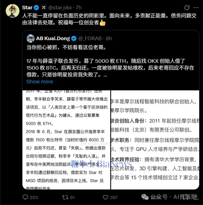 然而,仅两日后,随着数字货币交易平台OKX创始人徐明星在社交平台上的一次互动,一则涉及疑似摩尔线程联合创始人李丰欠债不还的旧案再次进入公众视野。
