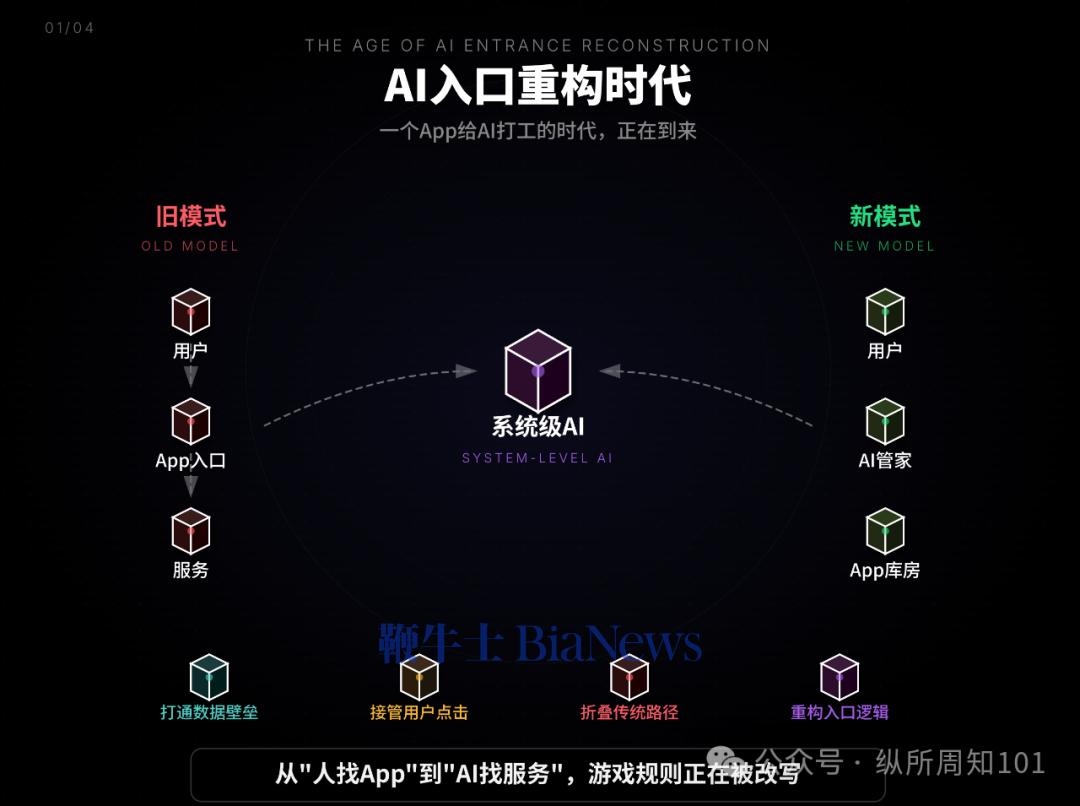 所谓的 AI 入口,就是要改变交互的"坐标轴",把交互从"人找 App"的水平线上,引导到"AI 找服务"的垂直线上。