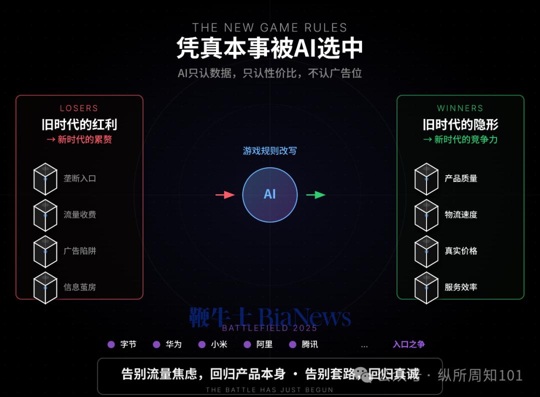 因为通过信息差、通过流量垄断获得的"不公平利润"一旦被 AI 抹平,恶性的流量战就很难打起来。要打,拿产品质量打,拿物流速度打,拿真金白银的价格打。