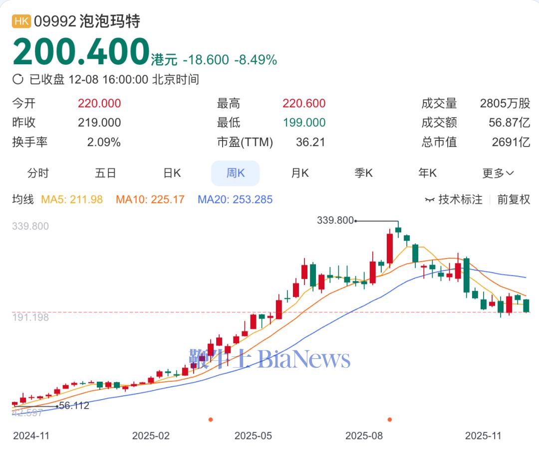 今天(12月8日)下午,泡泡玛特股价盘中一度跌破200港元/股的大关。截至收盘,其股价回升至200.4港元/股,但相较于年内最高点340港元/股,已经下跌了超过1/3。